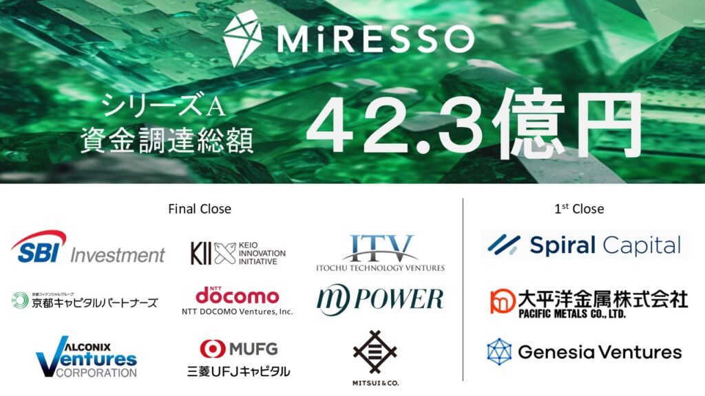 株式会社MiRESSO(本社:青森県三沢市、代表取締役 CEO:中道 勝、以下「MiRESSO」という)は、Spiral CapitalとSBIインベストメントを共同リード投資家とした、12社の投資家を引受先とする、総額42.3億円のシリーズAをクローズしたことをお知らせいたします。なお、今回の資金調達は、2025年8月に公表した約18.3億円の1stクローズに加えて、共同リード投資家であるSBIインベストメントを中心に、9社の新規投資家を引受先として約24億円の追加資金調達を完了したことでファイナルクローズとなりました。また、今回の資金調達により、創業して約3年間における累計資金調達額は、エクイティで約44.8億円、補助金も合わせると約66.8億円となります。